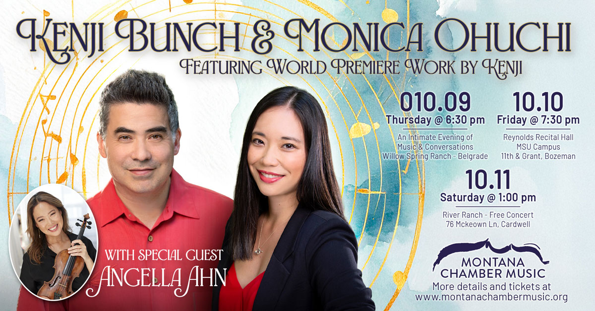 Enjoy an evening of chamber music, which includes the highly-anticipated premiere of our first commissioned work, performed by the composer Kenji Bunch with violinist Angella Ahn. Pianist Monica Ohuchi adds her artistry to this special concert.